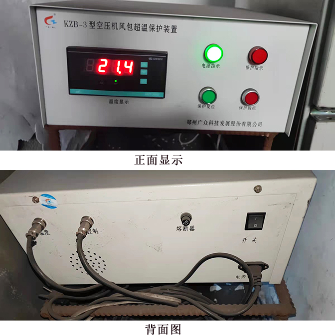 廣眾科技KZB-3型儲(chǔ)氣罐超溫保護(hù)裝置,電源采用AC220V供電,顯示儲(chǔ)氣罐溫度,在超過(guò)設(shè)定的120℃時(shí)候,報(bào)警指示燈變亮,警報(bào)器高強(qiáng)度報(bào)警,設(shè)備中保護(hù)繼電器輸出,控制空壓機(jī)停機(jī),本裝置具備脫機(jī)功能。下面是公司第六代產(chǎn)品的客戶現(xiàn)場(chǎng)安裝圖: