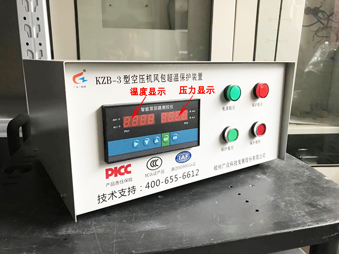 (1)正面圖見下:上方印刷有公司Logo和產(chǎn)品名稱:KZB-3型空壓機風(fēng)包超溫保護裝置;下方左側(cè)是顯示儀表,儀表左側(cè)是溫度顯示,右側(cè)是壓力顯示(如圖標示);下方右邊有電源指示燈和保護指示燈,有保護復(fù)位按鈕和保護脫機按鈕;右側(cè)下方印刷有公司名稱:鄭州廣眾科技發(fā)展股份有限公司。